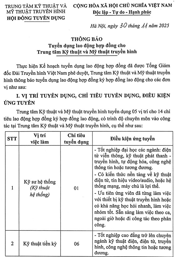 Thực hiện Kế hoạch tuyển dụng lao động hợp đồng đã được Tổng Giám đốc Đài Truyền hình Việt Nam phê duyệt, Trung tâm Kỹ thuật và Mỹ thuật truyền hình thông báo tuyển dụng lao động hợp đồng ký hợp đồng lao động cho các đơn vị như sau: