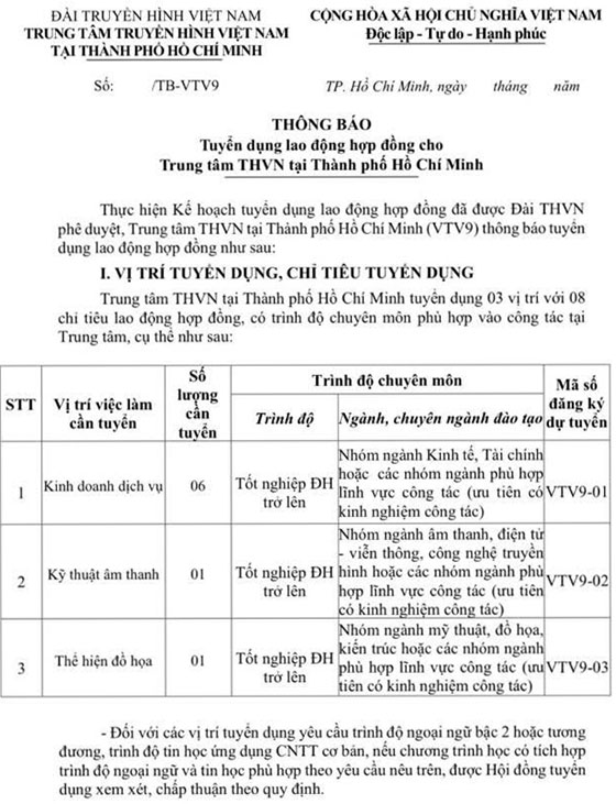 VTV9.vtv.vn – Trung tâm THVN tại Thành phố Hồ Chí Minh tuyển dụng 03 vị trí với 08 chỉ tiêu lao động hợp đồng, có trình độ chuyên môn phù hợp vào công tác tại Trung tâm.