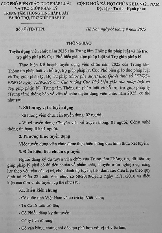 Trung tâm Thông tin pháp luật và hỗ trợ, trợ giúp pháp lý, Cục Phổ biến giáo dục pháp luật và Trợ giúp pháp lý tuyển dụng viên chức năm 2025, cụ thể như sau:
