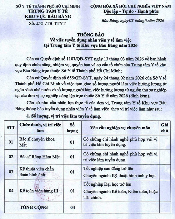 Trung tâm Y tế Khu vực Bàu Bàng, TP. HCM tuyển dụng nhân viên y tế năm 2026, như sau: