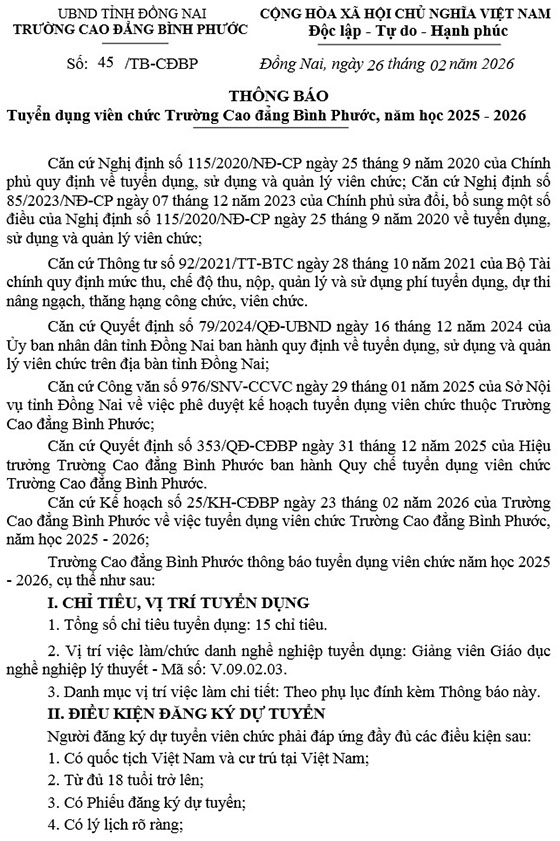 Trường Cao đẳng Bình Phước thông báo tuyển dụng viên chức năm học 2025 – 2026, cụ thể như sau: