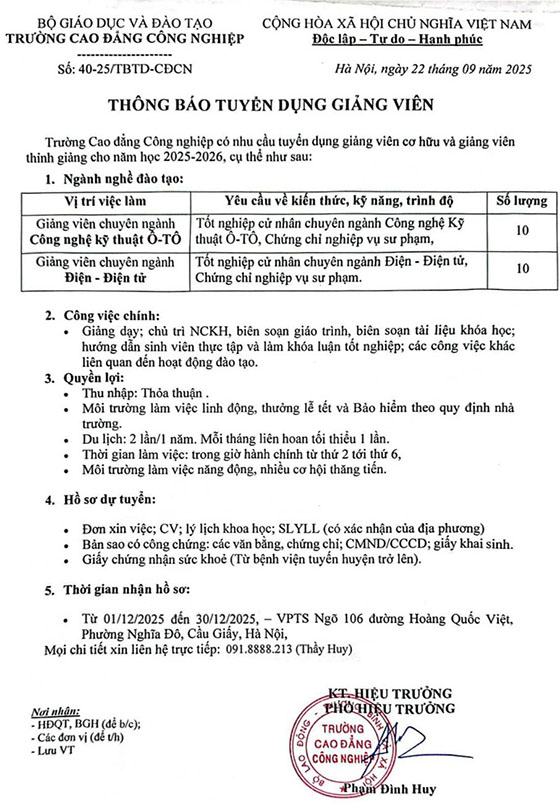 Trường Cao đẳng Công nghiệp có nhu cầu tuyển dụng giảng viên cơ hữu và giảng viên thỉnh giảng cho năm học 2025-2026, cụ thể như sau: