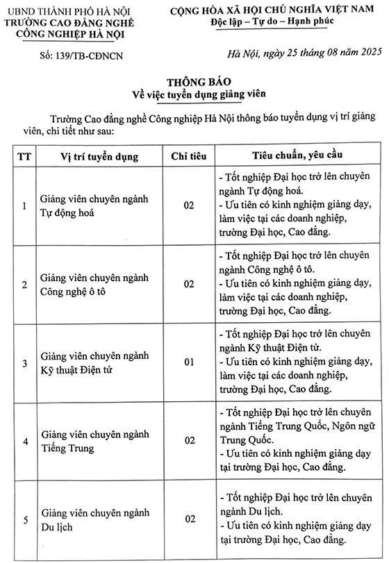 Trường Cao đẳng nghề Công nghiệp Hà Nội thông báo tuyển dụng vị trí giảng viên, chi tiết như sau:
