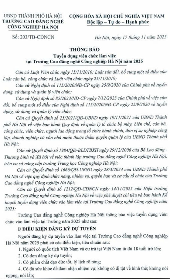 Trường Cao đẳng nghề Công nghiệp Hà Nội thông báo việc tuyển dụng viên chức vào làm việc tại Trường năm 2025 như sau: