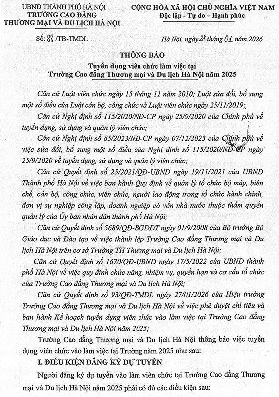 Trường Cao đẳng Thương mại và Du lịch Hà Nội thông báo việc tuyển dụng viên chức vào làm việc tại Trường năm 2025 như sau: