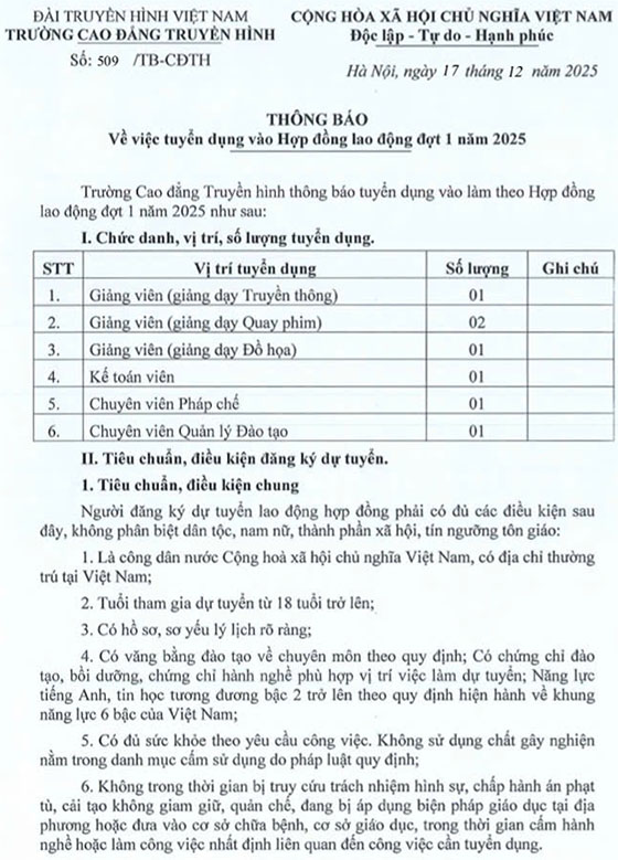Trường Cao đẳng Truyền hình thông báo tuyển dụng vào làm theo Hợp đồng lao động đợt I năm 2025 như sau:
