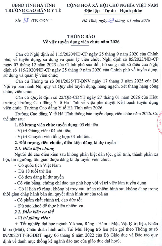 Trường Cao đẳng Y tế Hà Tĩnh thông báo tuyển dụng viên chức năm 2026. Cụ thể như sau: