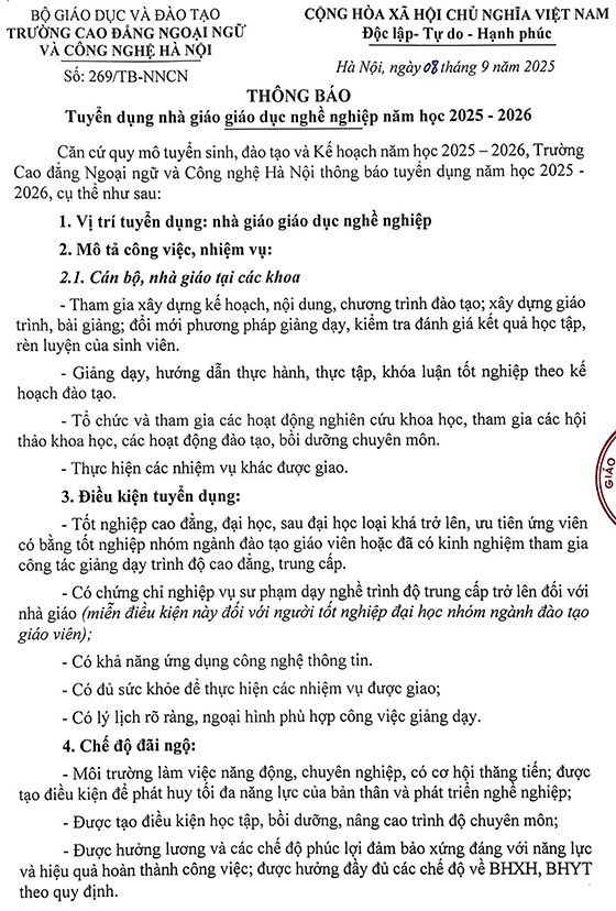 Trường CĐ Ngoại ngữ và Công nghệ Hà Nội tuyển dụng nhà giáo giáo dục nghề nghiệp năm học 2025 – 2026