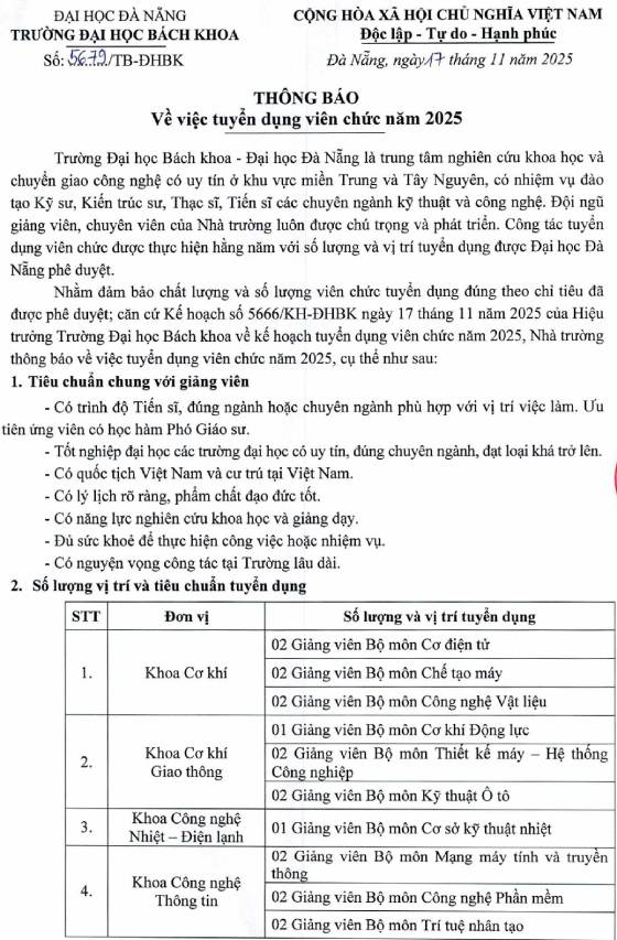 Nhằm đảm bảo chất lượng và số lượng viên chức tuyển dụng đúng theo chỉ tiêu đã được phê duyệt; căn cứ Kế hoạch số 5666/KH-ĐHBK ngày 17 tháng 11 năm 2025 của Hiệu trưởng Trường Đại học Bách khoa về kế hoạch tuyển dụng viên chức năm 2025, Nhà trường thông báo về việc tuyển dụng viên chức năm 2025, cụ thể như sau: