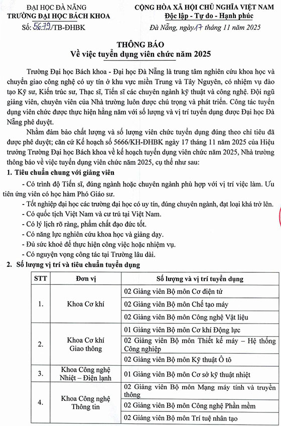 Trường Đại học Bách khoa – Đại học Đà Nẵng thông báo về việc tuyển dụng viên chức năm 2025, cụ thể như sau:
