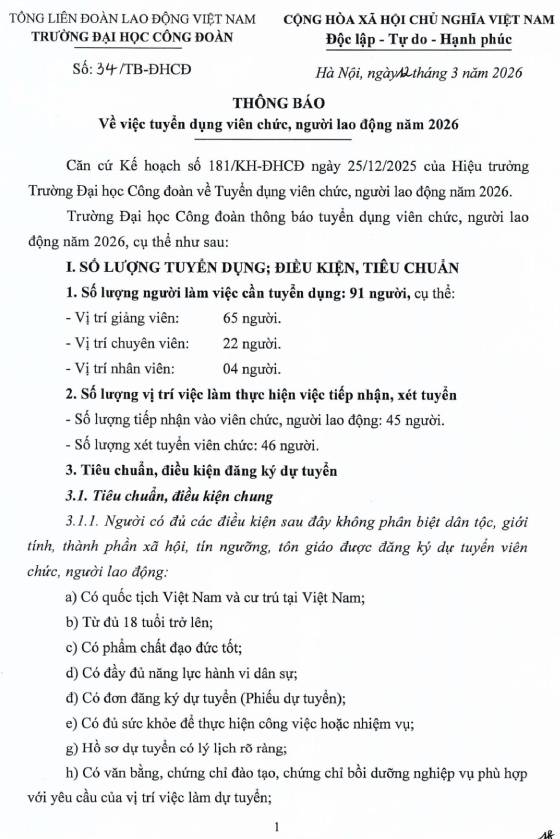 Trường Đại học Công đoàn thông báo tuyển dụng viên chức, người lao động năm 2026, cụ thể như sau: