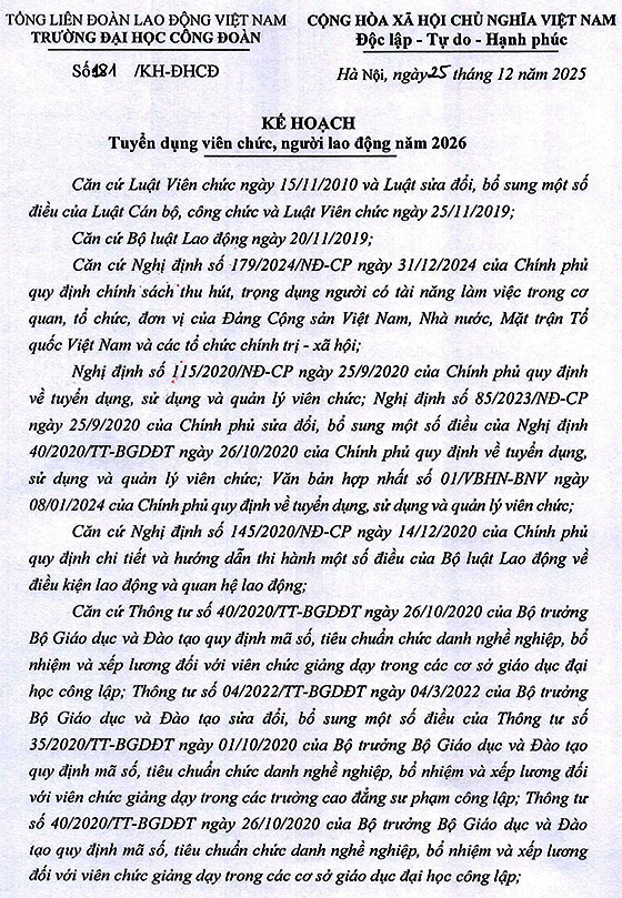 Trường Đại học Công Đoàn tuyển dụng viên chức, người lao động năm 2026, như sau: