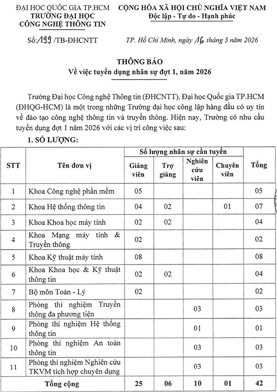 Trường Đại học Công nghệ Thông tin, ĐHQG – HCM tuyển dụng nhân sự đợt 1 năm 2026