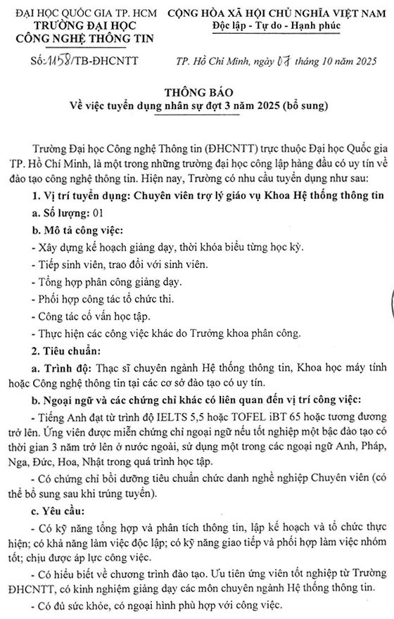 Trường Đại học Công nghệ Thông tin, ĐHQG – HCM tuyển dụng nhân sự đợt 3 năm 2025