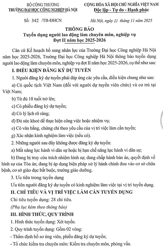 Căn cứ Kế hoạch bổ sung nhân lực của Trường Đại học Công nghiệp Hà Nội năm học 2025-2026, Trường Đại học Công nghiệp Hà Nội thông báo tuyển dụng người lao động làm chuyên môn, nghiệp vụ đợt II năm học 2025-2026, cụ thê như sau: