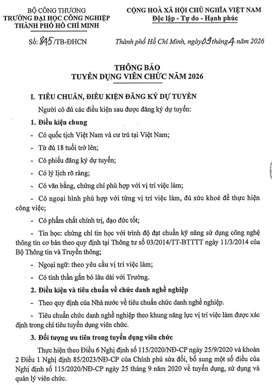 Trường Đại học Công nghiệp Thành phố Hồ Chí Minh thông báo tuyển dụng viên chức năm 2026, cụ thể như sau: