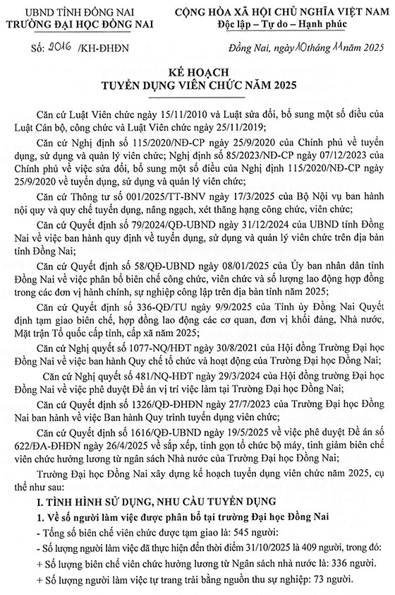 Trường Đại học Đồng Nai xây dựng kế hoạch tuyển dụng viên chức năm 2025, cụ thể như sau:
