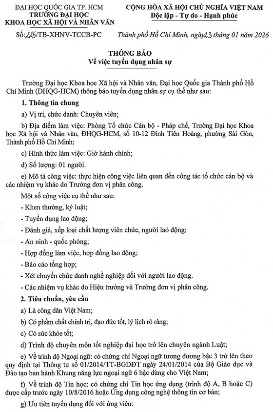 Trường Đại học Khoa học Xã hội và Nhân văn, Đại học Quốc gia Thành phó Hồ Chí Minh (ĐHQG-HCM) thông báo tuyển dụng nhân sự cụ thể như sau: