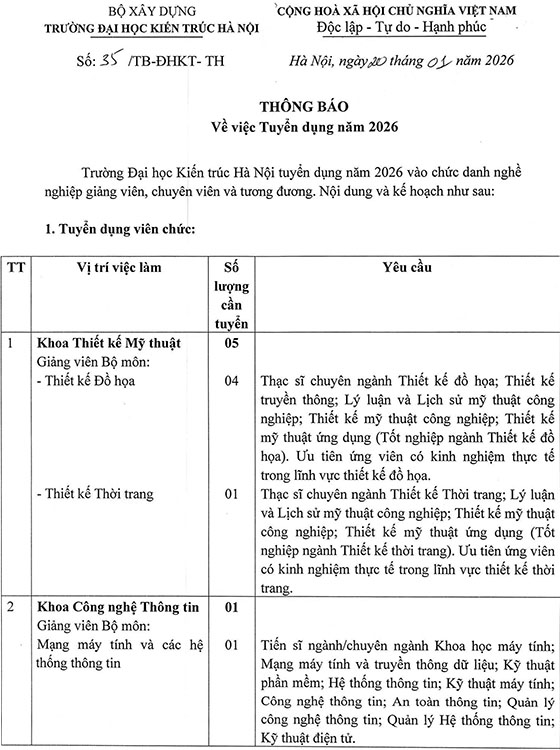 Trường Đại học Kiến trúc Hà Nội tuyển dụng năm 2026 vào chức danh nghề nghiệp giảng viên, chuyên viên và tương đương. Nội dung và kế hoạch như sau: