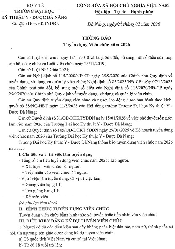 Trường Đại học Kỹ thuật Y – Dược Đà Nẵng thông báo tuyển dụng viên chức năm 2026, như sau: