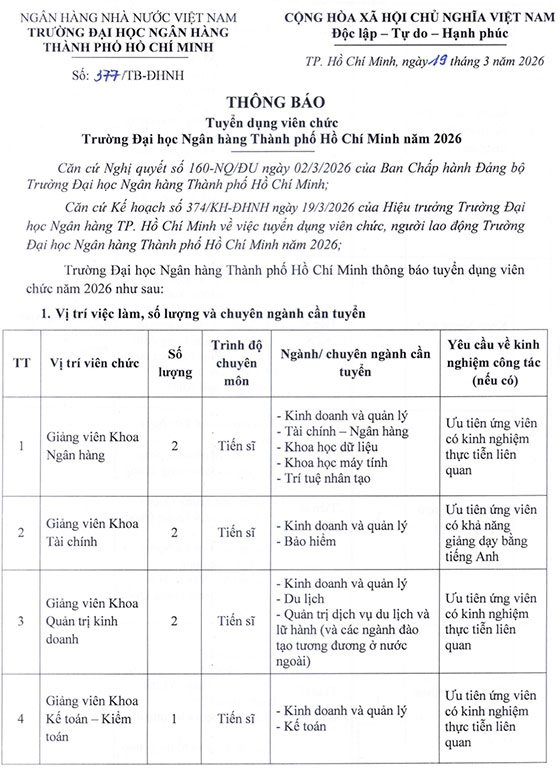 Trường Đại học Ngân hàng Thành phố Hồ Chí Minh thông báo tuyển dụng viên chức năm 2026 như sau: