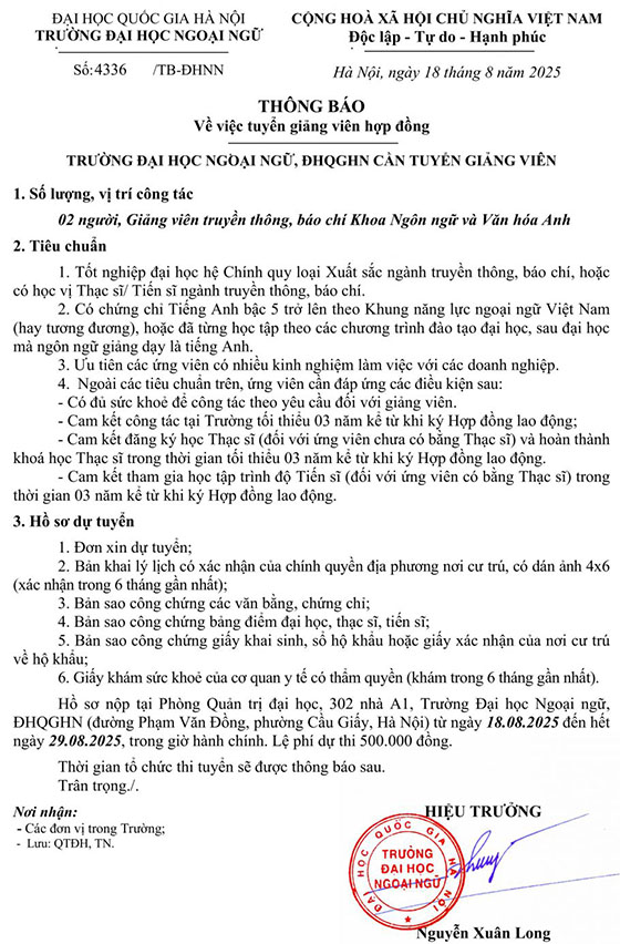 Trường Đại học Ngoại Ngữ, ĐHQGHN tuyển dụng giảng viên năm 2025