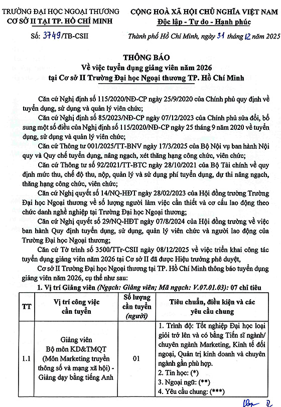 Trường Đại học Ngoại thương Cơ sở II – TP. HCM tuyển dụng giảng viên năm 2026, như sau: