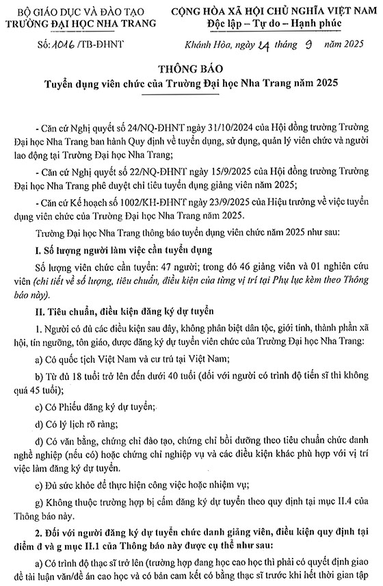 Trường Đại học Nha Trang thông báo tuyển dụng viên chức năm 2025 như sau: