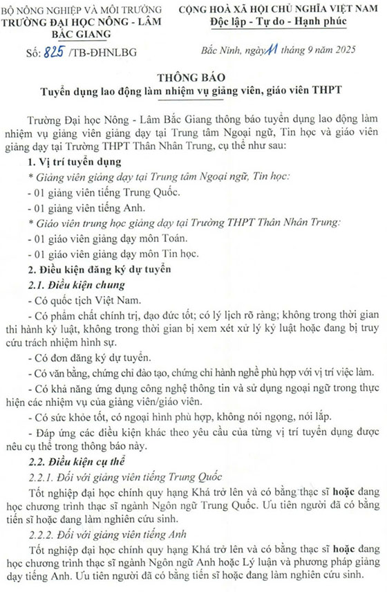 Trường Đại học Nông – Lâm Bắc Giang thông báo tuyển dụng lao động làm nhiệm vụ giảng viên giảng dạy tại Trung tâm Ngoại ngữ, Tin học và giáo viên giảng dạy tại Trường THPT Thân Nhân Trung, cụ thể như sau: