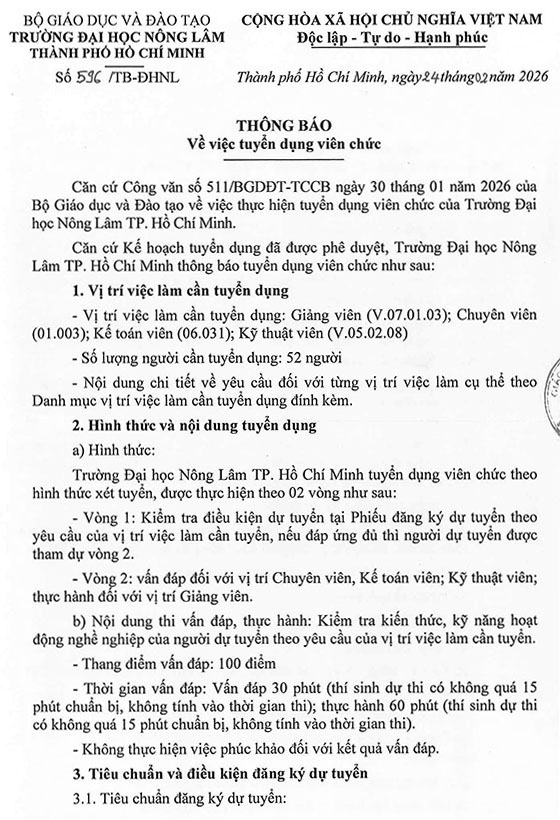 Căn cứ Kế hoạch tuyển dụng đã được phê duyệt, Trường Đại học Nông Lâm TP. Hồ Chí Minh thông báo tuyển dụng viên chức như sau: