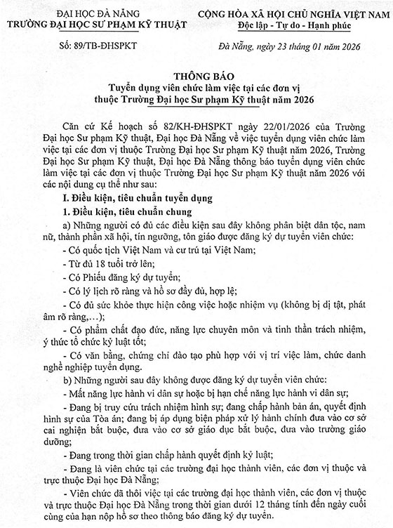 Đại học Đà Nẵng thông báo tuyển dụng viên chức làm việc tại các vị thuộc Trường Đại học Sư phạm Kỹ thuật năm 2026 với các nội dung cụ thể như sau: