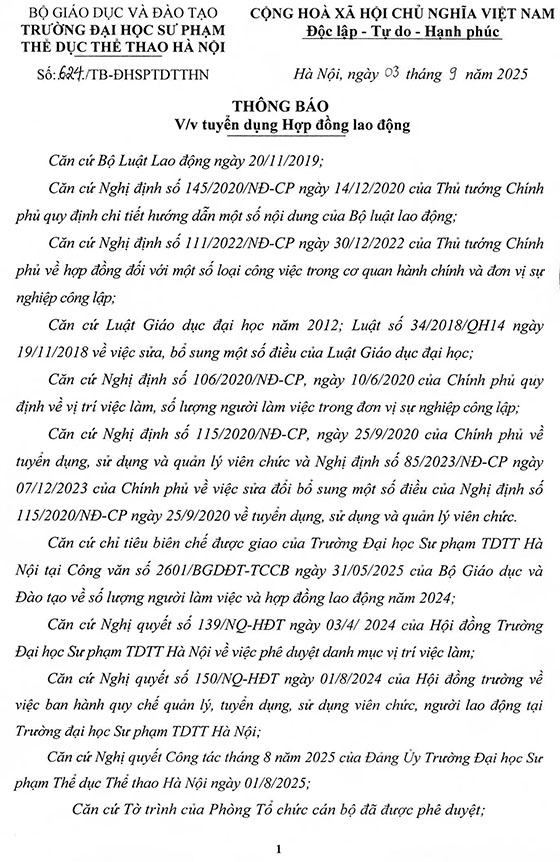 Trường Đại học Sư phạm Thể dục Thể thao Hà Nội thông báo tuyển dụng hợp đồng lao động, cụ thể như sau: