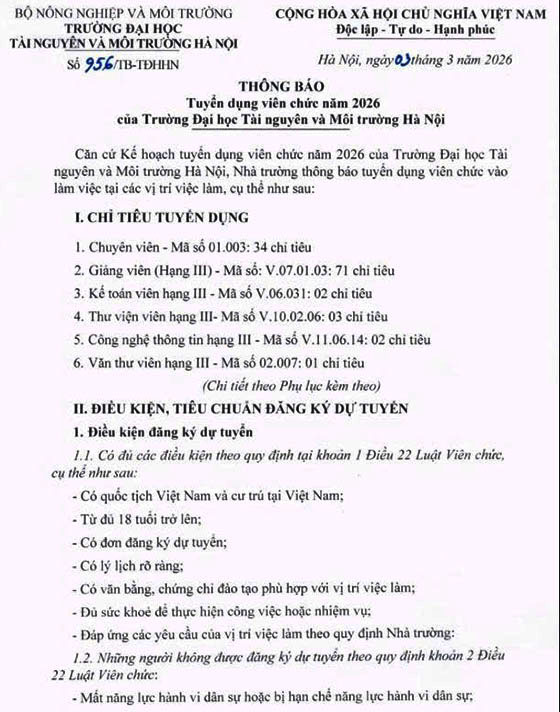 Căn cứ Kế hoạch tuyển dụng viên chức năm 2026 của Trường Đại học Tài nguyên và Môi trường. Nhà trường thông báo tuyển dụng viên chức vào các vị trí việc làm, cụ thể như sau: