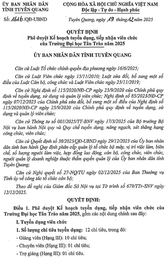 Trường Đại học Tân Trào, Tuyên Quang tuyển dụng, tiếp nhận viên chức năm 2025