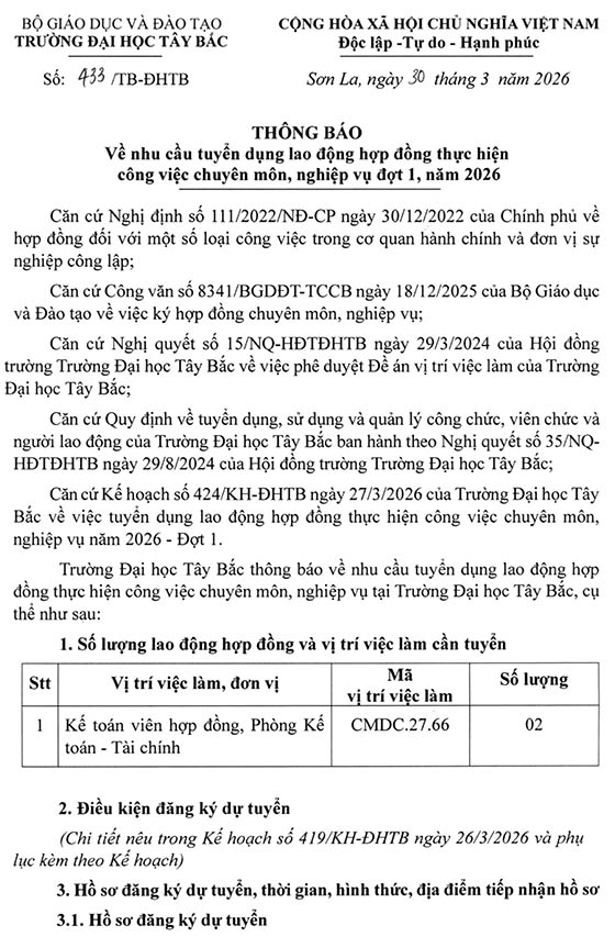 Trường Đại học Tây Bắc thông báo về nhu cầu tuyển dụng lao động hợp đồng thực hiện công việc chuyên môn, nghiệp vụ tại Trường Đại học Tây Bắc, cụ thể như sau:
