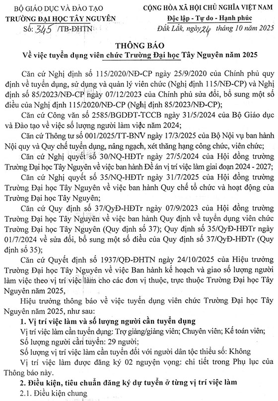 Hiệu trưởng thông báo về việc tuyển dụng viên chức của trường Đại học Tây Nguyên, cụ thể như sau: