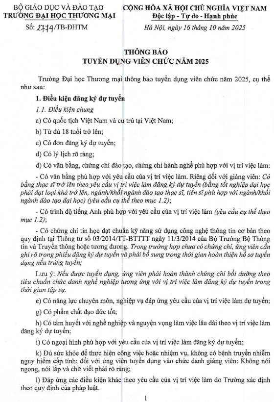 Trường Đại học Thương mại tuyển dụng viên chức năm 2025