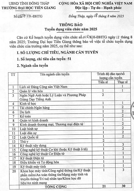 Căn cứ Kế hoạch tuyển dụng viên chức số//2Ê/KH-ĐHTG ngày 18 tháng 8 năm 2025; Trường Đại học Tiền Giang thông báo về việc tổ chức tuyển dụng viên chức của trường năm 2025, cụ thể như sau: