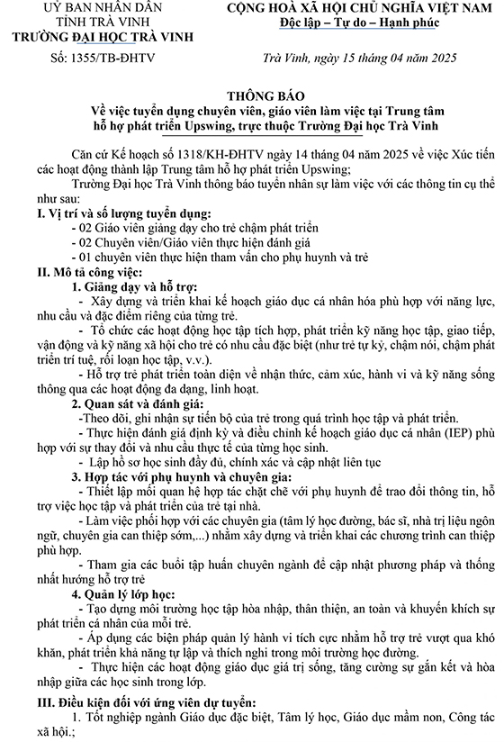 Trường Đại học Trà Vinh thông báo tuyển nhân sự làm việc như sau: