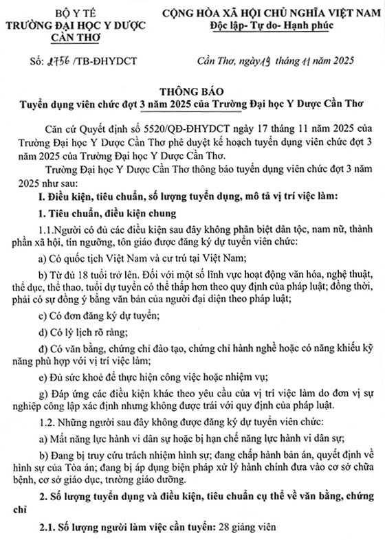 Trường Đại học Y Dược Cần Thơ thông báo tuyển dụng viên chức đợt 3 năm 2025 như sau: