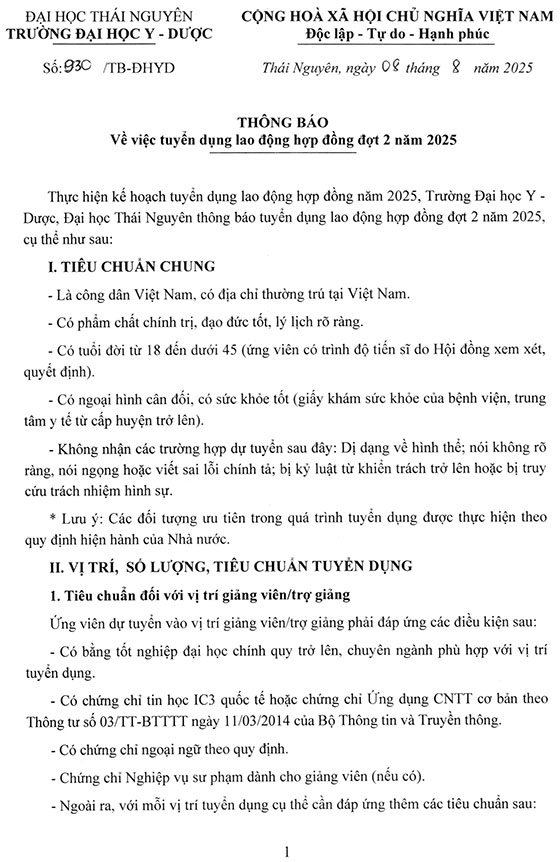 Trường Đại học Y – Dược, Đại học Thái Nguyên tuyển dụng lao động hợp đồng đợt 2 năm 2025