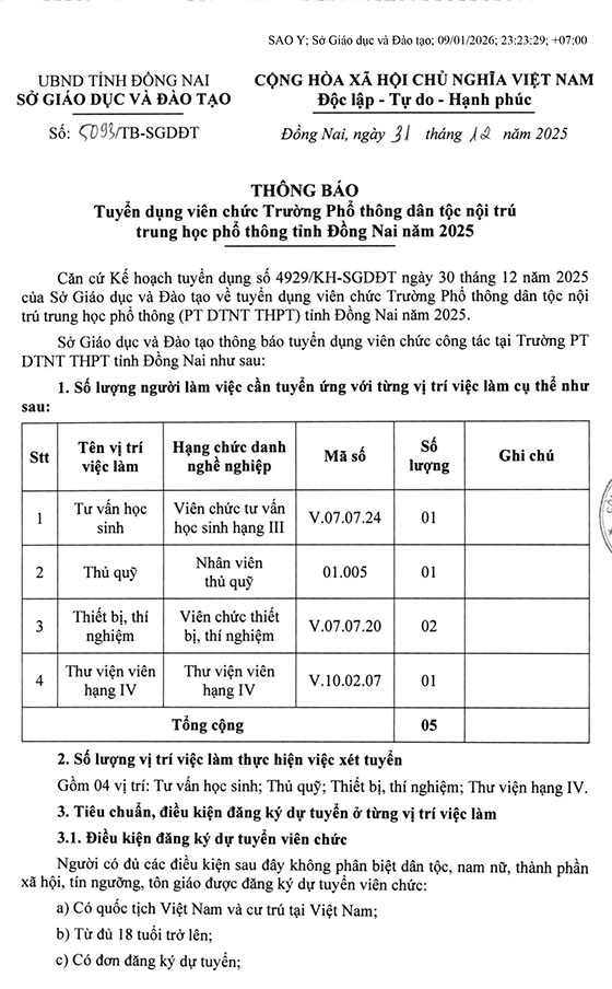 Trường Phổ thông dân tộc nội trú tỉnh Đồng Nai thông báo tuyển dụng