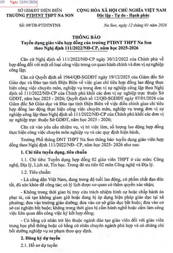 Trường Phổ thông DTNT THPT Na Son thông báo tuyển dụng giáo viên hợp đồng theo Nghị định 111/2022/NĐ- CP, năm học 2025- 2026 như sau: