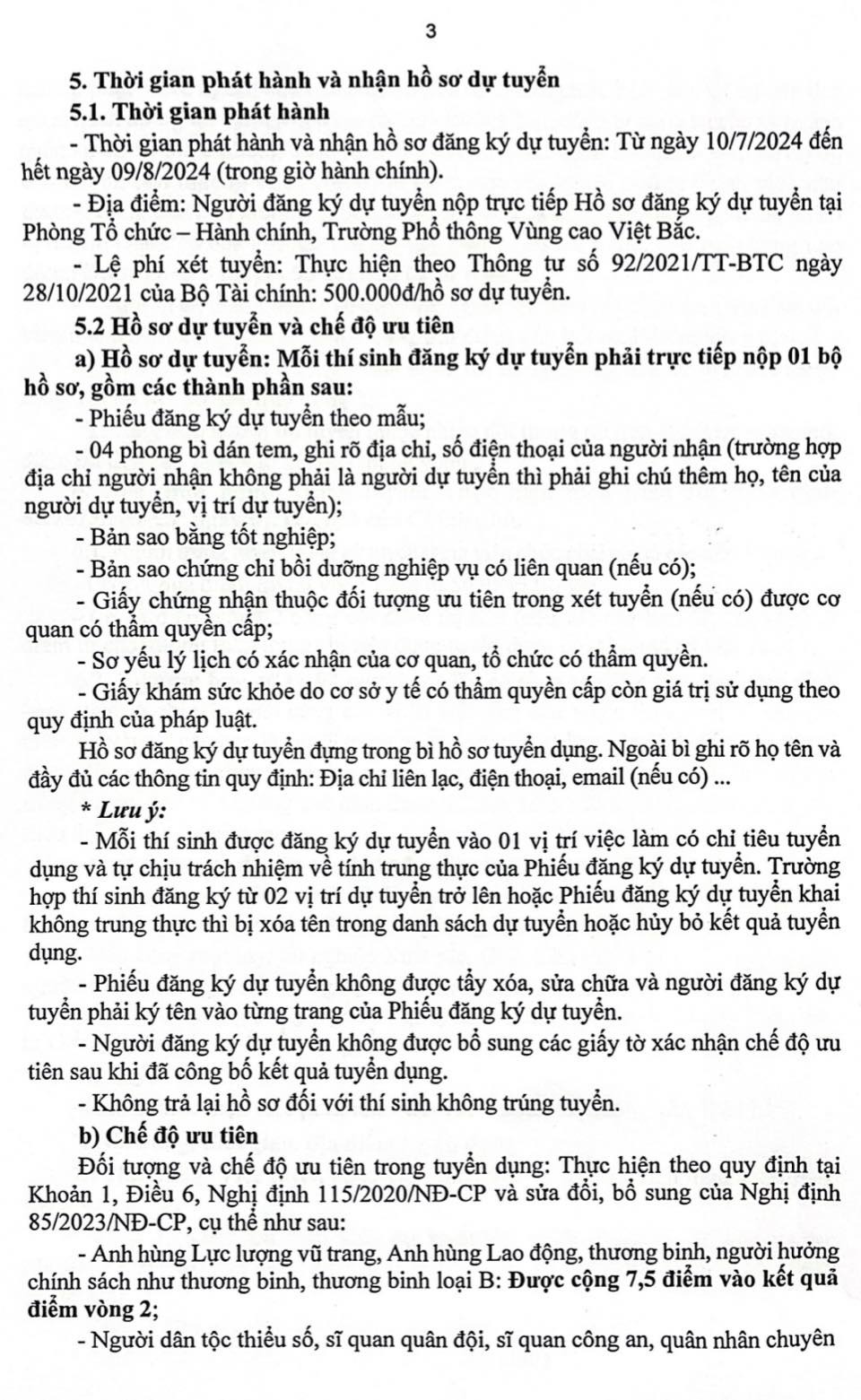 Trường PT Vùng cao Việt Bắc, Thái Nguyên tuyển dụng viên chức năm 2024, như sau: