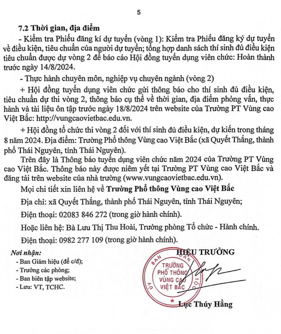 Trường PT Vùng cao Việt Bắc, Thái Nguyên tuyển dụng viên chức năm 2024