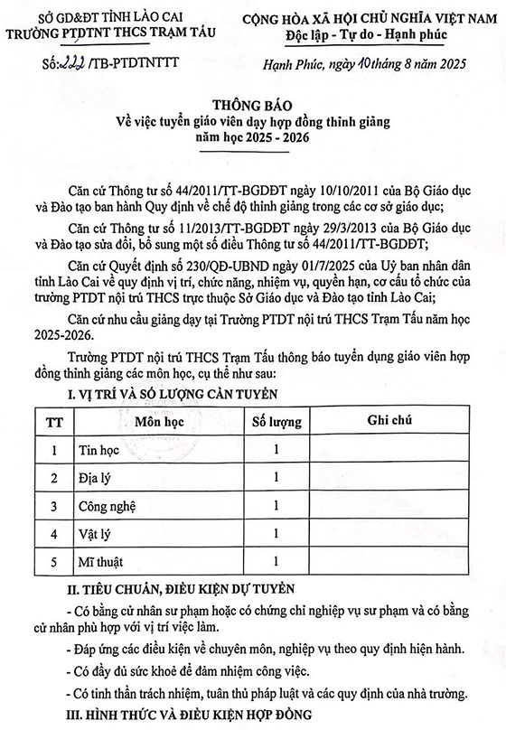 Trường PTDT nội trú THCS Trạm Tấu thông báo tuyển dụng giáo viên hợp đồng thỉnh giảng các môn học, cụ thể như sau:
