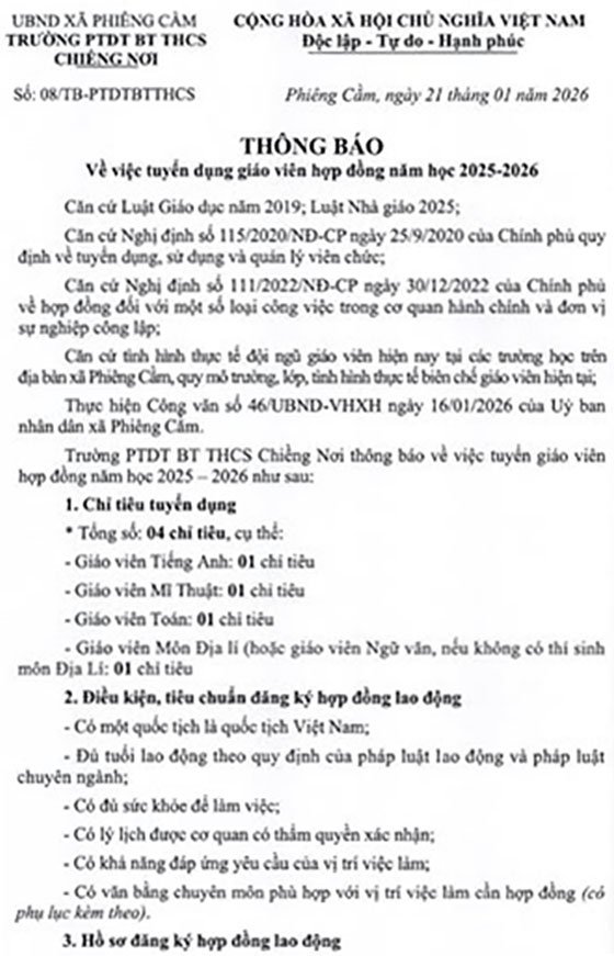 Trường PTDTBT THCS Chiềng Nơi, xã Phiêng Cằm, tỉnh Sơn La tuyển dụng giáo viên hợp đồng năm học 2025 – 2026