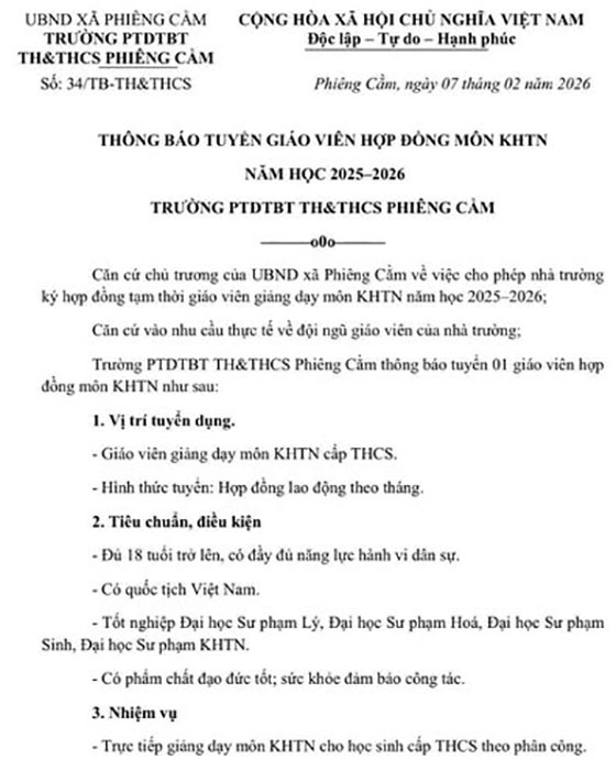 THÔNG BÁO TUYỂN DỤNG GIÁO VIÊN HỢP ĐỒNG NĂM HỌC 2025 – 2026 CỦA TRƯỜNG PTDTBT TH & THCS PHIÊNG CẰM
