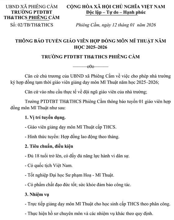 Trường PTDTBT TH&THCS Phiêng Cằm thông báo tuyển 01 giáo viên hợp đồng môn Mĩ Thuật như sau: