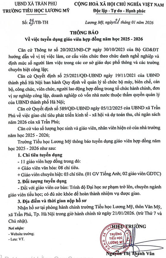 Trường Tiểu học Lương Mỹ thông báo tuyển dụng giáo viên hợp đồng năm học 2025 – 2026 như sau: